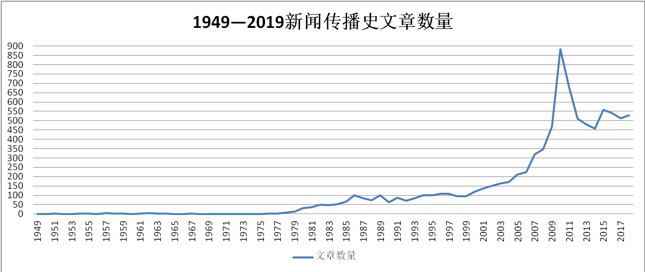 从上图《1949-2019新闻传播史书籍数量》可以看到每年数量变化情况。1949-1977年,中国的新闻传播史书籍数量比较少。有相当多的年份新闻传播史书籍数量则为零,它们分别是1949、1967、1969、1970、1972、1974、1975、1976年,这些年份中除1949年新中国刚成立比较特殊外,其他年份均为“文革”期间;少数年份的新闻传播史书籍数量达到了两位数,如1957、1958、1959年分别为12、13、17种)外,其他年份均为个位数。从1978年开始,中国的新闻传播史书籍数量开始上升,当年就出版了6种新闻传播史书籍, 1979年,中国的新闻传播史书籍数量达到了20种,达到了历史新高。此后各个年份,数量都在两位数之上,甚至到1985、1986、1987、1988年迎来一个增长小高峰,均超过50种,四个年份数量分别55、53、63、54;2000年,中国的新闻传播史书籍数量再次创造历史新高,达到了72种,而在2013-2015年又进入一个增长小高峰,三个年份分别是91、114、107,尤其2014年的114种则再次创造了新闻传播史书籍数量的历史新高。因为2019年还在进行中,数量还不多,目前仅统计到10种,数据还会不断更新,所以表中没有将2019年的数据放进去做成曲线图,才能更准确反映出数量变化。统计中国新闻传播史文章数量难度较大,笔者根据人民大学图书馆“中文发现”检索系统中的“期刊”(选择关键词“新闻史”),不完全统计出1949-2019年(截止2019年6月30日,其实数据库仅到4月)中国关于新闻传播史的文章达到9228篇。