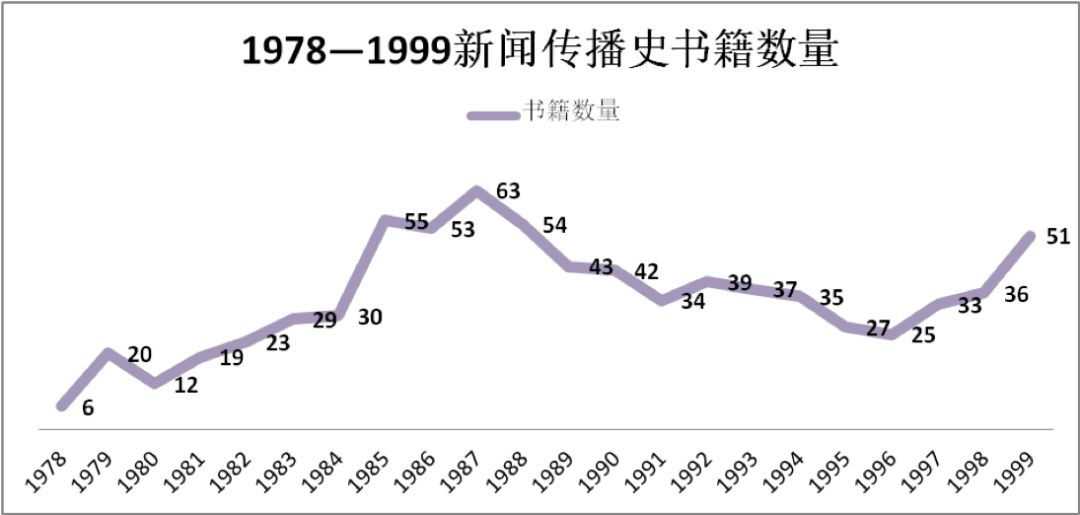 正是在新中国新闻传播事业及其新闻传播教育和新闻学术研究迅速恢复与全面发展的过程中,新闻传播史研究也恢复发展并逐渐展开,取得不俗的学术成绩,结出了累累硕果。在《四个阶段新闻传播史书籍数量表》和《四个阶段平均新闻传播史书籍数量表》中,1978-1999年中国的新闻传播史研究书籍数量是766种,每年平均为34.82种;在《四个阶段新闻史研究期刊文章数量》和《四个阶段新闻史平均文章数量》中,1978-1999年中国的新闻传播史研究文章数量则达1572篇,平均为71.45篇。在该阶段,首先是中国的新闻传播史研究的恢复发展。1978年,中国出版了6种新闻传播史书籍,如《中国新闻事业史讲义:新民主主义革命时期》(复旦大学新闻系新闻事业史教研室编印)、《中国报刊工作文集》(中国人民大学新闻系印)、韬奋著《经历》(三联书店)等。1979年,出版的新闻传播史书籍达20种,1980年有所回落,仅12种,1981年则达19种,1982年23种,1984年30种,1985年55种,1986年53种,1987年63种,1988年54种,1989年43种。文章方面也是基本如此。1978年,仅7篇,此后连续上升,1979年13篇,1980年32篇,1981年37篇,1982年49篇,1983年48篇,1984年52篇,1985年66篇,1986年99篇,1987年84篇,1988年75篇,1989年101篇。新中国的新闻传播史研究不仅恢复,而且达到历史高点。除了数量统计的研究成果恢复发展之外,该阶段的新中国新闻传播史研究恢复发展还表现在:第一是正确指导思想的恢复。观念创新成为推动中国新闻史研究恢复发展的精神动力。新闻传播史研究者以党的十一届三中全会确立的解放思想,实事求是思想路线为指导,逐渐消除“左”倾思想影响。1980年4月,中国社会科学院新闻研究所和北京新闻学会举行了一次中国新闻业史编写座谈会。与会者一致认为:新闻史研究必须坚持马列主义、毛泽东思想。1985年,李龙牧出版的《中国新闻事业史稿》运用马克思主义理论和方法研究中国新闻传播研究,使得新闻史“革命范式”得到了恢复和延续。中国新闻史研究的重点,由报刊形式转向宣传内容,由历史沿革转向社会作用,由历史描述转向历史分析。有研究者认为:这是中国新闻史研究的又一次突破,它推动着中国新闻史研究向深度和广度发展,成为新闻传播学科领域中较为稳定、成果较多的一个部分。[14]第二是研究者队伍的恢复。1978年,几个大学新闻系重建新闻史研究室组,恢复新闻史课程教学,中国人民大学和复旦大学新闻系相继招收新闻史硕士研究生。1982年,已有14所大学的新闻系或新闻专业开设了新闻史课程,中国人民大学新闻系设立新闻史教师进修班,使新闻史教师队伍成倍增长。至1985年,全国创建了40余个新闻学会和五十多个新闻学研究机构,其中分工从事新闻史研究工作的,全国不下150人,初步形成了一支多层次、多梯队、多兵种、老中青相结合的新闻史研究者队伍。[15]第三是新闻史料整理和工具书编撰得到恢复发展。1979年,社科院新闻研究所创办了以新闻史料搜集和研究为主《新闻研究资料》。同年,北京广播学院新闻系编撰了《中国广播史料选辑》。1980年,暨南大学新闻系开始编撰《华南新闻事业史料》。全国各地地方新闻史整理和研究得到加强,陆续创办了《新华社史料》、天津《新闻史料》《湖北省武汉市新闻志参考史料》《武汉新闻史料》《新闻界人物》等新闻史料刊物。1982年,社科院新闻所负责编撰的大型资料性新闻工具书《中国新闻年鉴》正式出版。第四是学科地位的恢复发展,被确立为“历史的科学”。1985年,方汉奇在论文《新闻史是历史的科学》中认为:“新闻史是一门科学,是一门考察和研究新闻事业发生发展历史及其衍变规律的科学。它和新闻理论、新闻业务一样,都是新闻学的重要组成部分。新闻史又是一门历史的科学。在门类繁多的历史科学中,它属于文化史的范畴,是文化史的重要组成部分。”[16]
