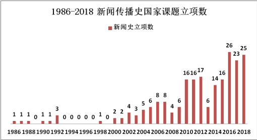 历史是一面镜子,是人类最好的老师。站在新中国成立70年的历史关口,回顾新中国70年新闻传播研究历史,虽然我们发现还存在许多值得改进之处,如理论思维不足、问题意识差、研究的重复建设、学术功力差、史学基础薄、史识判断能力低、学术规范不强等,但是中国的新闻传播史研究硕果累累,取得了历史以来最大的成就,研究队伍日益壮大,思想不断解放,视野不断拓展,范式不断更新,内容不断丰富,方法不断创新,成果数量不断增加,质量不断提升,学术地位和社会影响不断扩大,并表现出五个较为明显的发展趋势。第一,新闻传播史研究日益推动中国特色新闻学学科地位不断提升。1985年,新闻史是历史的一门科学成为新闻史研究者的普遍共识,从而确定了新闻传播史的学科属性。国家科委1987年年度统计年报工作文件中,把新闻学正式列为我国社会科学和人文学科中15个学科项目之一,居第11位,并标明新闻学科包括中国新闻事业史、国外新闻事业史等11方面,不仅从制度上结束了“新闻无学”的局面[32],而且新闻史作为新闻学最重要的组成部分的地位得到了进一步巩固。1989年,习近平强调,“新闻学作为一门科学,与政治的关系很密切。”1990年,国务院学位委员会将新闻学列入文学门下一级学科中国语言文学之下。1992年,国家技术监督局发布的国家标准《学科分类与代码》规定新闻学与传播学是一级学科,包括新闻理论、新闻史、新闻业务、新闻事业经营管理、广播与电视、传播学、新闻学与传播学其他学科等二级学科。同年,方汉奇成为国务院学位委员会第三届文学评议组成员。1997年,我国第二次颁布《授予博士、硕士学位和培养研究生的学科、专业目录》,文学门类增设一级学科——新闻传播学,下设两个二级学科:新闻学和传播学。新闻传播学第一次得到了国务院学位委员会的认同,新闻传播学学科评议组单列,新闻传播学的独立性得到了国家认可。[33]2004年,中共中央通过的《关于进一步繁荣发展哲学社会科学的意见》中,将“新闻学”列为国家重点发展的哲学社会科学九大学科之一。2016年,新闻学成为对哲学社会科学具有支撑作用的九大学科之一。习近平强调,要加快完善对哲学社会科学具有支撑作用的学科,打造具有中国特色和普遍意义的学科体系。[34]中国特色新闻学学科地位的不断提升,是所有学科研究者的共同努力的结果,但是历史研究是一切社会科学的基础,新闻传播史研究则为中国特色新闻学学科地位的提升发挥了基础性的支撑作用。随着新闻传播史研究的繁荣发展,势必加快中国特色新闻学及其他哲学社会科学的蓬勃兴旺。第二,新闻传播史研究受到国家社科基金的高度重视和大力支持,推动着新闻传播史研究的向前发展。国家社科基金资助新闻传播史研究课题课追溯到1986年的重点课题《新闻事业与现代化》。1987年,《台湾新闻事业史》获得国家社科基金一般项目立项。1988年,《中国新闻事业通史》获得国家社科基金重点项目立项。1986-2018年获得国家社科基金项目立项的新闻传播史变化情况见下图: