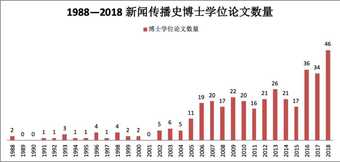 虽然不能完全说撰写了新闻传播史博士学位论文的博士生就等同于新闻传播史研究者,但最起码期可以说明他们经受过新闻传播史的训练或一段时内从事过新闻传播史研究,且大部分人迈向了新闻传播史研究道路,逐渐成为新闻传播史研究的生命军。从《1988-2018年新闻传播史博士学位论文数量》图中,撰写新闻传播史博士学位论文的博士生总体呈上升趋势。根据对各设有新闻传播专业博士点主要院校的数据库进行的搜集,结合2016-2018年《中国新闻传播教育年鉴》和中国知网博士学位论文数据库提供的参考,笔者不完全统计出从1988-2018年,新闻传播史博士学位论文总数为364篇,其中1949-1977年曲折前行阶段为0,在1978-1999年恢复展开(实际是1988-1999年)20篇,2000-2012年反思创新阶段164篇,2013年至今繁荣发展阶段180篇,每个阶段平均数为0、1.67篇、12.62篇、30篇。这些新闻传播史方向博士接受过良好的教育和严格的学术训练,具有较深厚的理论素养、学术根基和科研能力,能立足中国、放眼世界,坚持历史唯物主义立场、观点、方法来认识和记述新闻历史,有助于推出一批有思想穿透力的新闻传播史精品力作。第五,不断加强新闻传播史研究的学术交流和合作,中国新闻史学会积极发挥新闻传播史研究团体的组织服务作用。1989年4月3日,由方汉奇、宁树藩等学者提议设立的中国新闻史学会获得民政部批准成立。1992年6月11日,举行成立大会,成为中华人民共和国境内新闻传播学方向唯一一家以研究中外新闻传播历史与现状的单位和个人自愿结成的全国性一级学术团体。这标志着中国新闻传播史研究进入到一个科学的、有序的、成熟的史学研究局面。中国新闻史学会积极召开新闻传播史学术会议,制订新闻传播史和相关领域的科研课题或计划,组织新闻传播史和相关学科的培训工作,举办新闻传播历史与现状展览和相关纪念活动,出版发行新闻传播学刊《新闻春秋》,协助其他出版机构对新闻传播学著作的出版与发行,收集、整理和保存相关资料,评选和奖励优秀新闻传播史研究成果,开展新闻传播史中外学术界交流活动。学会与新加坡南洋理工大学、华中科技大学等于1995年起联合举办“世界华文传媒与华夏文明”国际学术研讨会。1998年5月11日至13日,召开“中国新闻史学会换届暨98新闻史学术研讨会”,中国新闻史学会的会员由207人增加到396人,团体会员有45个,并吸收了美国、日本、澳大利亚、意大利、新加坡等国研究中国新闻史的学者为名誉会员。[35]