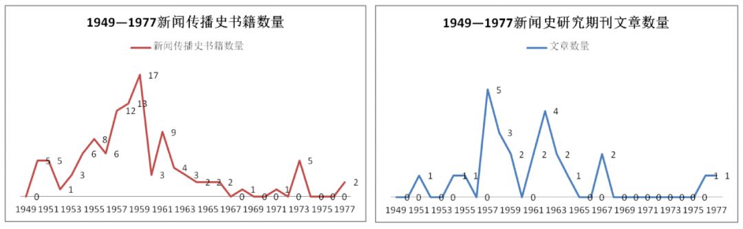 在十年“文革”期间,由于受极“左”路线的影响,新闻传播史的研究陷于停顿状态。这在《四个阶段新闻传播史书籍数量》中,该阶段中国的新闻传播史研究的书籍数量110种,平均每年为3.59种。有相当多的年份新闻传播史书籍数量则为零,它们分别是1949、1967、1969、1970、1972、1974、1975、1976年,这些年份中除1949年新中国刚成立比较特殊外,其他年份均为“文革”期间。在《四个阶段新闻史研究期刊文章数量表》中,中国的新闻传播史研究文章数量是26篇,每年平均0. 90篇,其中1949、1950、1952、1953、1956、1960、1965、1966、1968-1975等15个年份数量为零,大多年份均处于“文革”期间。