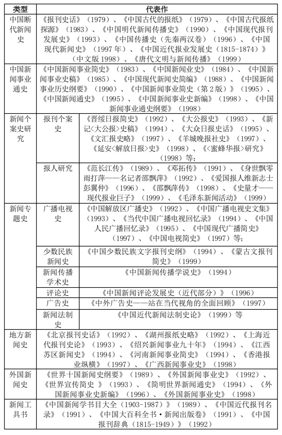 其次,是新中国的新闻传播史研究逐渐展开,全面开花。第一,中国断代新闻史,尤其是报刊史研究成果开始涌现。其中代表作是方汉奇的《中国近代报刊史》(上下)。该书于1981年6月出版,共分七个章57万字,概括了1815到1915年约100年间的报刊史,是厚积薄发之作,也是十一届三中全会以后最早问世的新闻史力作,开启了改革开放以后新闻学研究的新纪元。[17]第二,中国新闻事业通史著作取得突破性发展。该阶段中国新闻事业通史著作数量较多。最具代表性的通史著作是方汉奇等主编《中国新闻事业通史》三卷本。该书于1987立项,分别于1992、1996、1999年出版,这部专著由方汉奇任主编,宁树藩、陈业劭任副主编,由24个部门的50位学者用12年的时间合作完成。全书共263.5万字,上限起于公元前三世纪,下限止于1990年,时间跨度达2200年。[18]该书注重新闻事业自身发展及其经验评述,主要内容以报刊的历史为主,兼及通讯社、广播、电视、新闻摄影、新闻纪录电影、漫画、广告等新闻事业多个领域的历史,被认为是改革开放以来大陆新闻史研究成果的集大成之作,成为中国新闻史研究迈向新阶段的标志,使得中国新闻传播史研究成为一门独立的成熟学科。有研究者《中国新闻事业通史》是“现代化叙事”的书写尝试,其写作的意义在于,推动史学者反思如何进行“回归新闻本位”的历史书写。从将“新闻事业发展”作为研究主题、内容,探讨新闻“是什么”“说什么”“怎么说”“印证了什么”“起了什么作用”等的线性叙述;到思考如何从“现代化”切入,采取何种路径、观念和方法深挖“史料”, 形成“事实”,“描述、解释、贯穿”现代化情境下百年新闻事业发展。[19]第三,新闻个案史研究受到重视。既有报刊个案史著作有,又有报人研究著作。第四,新闻专题史研究成果丰硕。如广播电视史、少数民族新闻史、新闻传播学术史、评论史、广告史和新闻法制史等方面均有成果涌现。第五,地方新闻史著作不断出现。其中最具代表性的是1996年出版的《上海新闻史1850-1949》,全书11章83节,79万字,全面系统地介绍与评述1850至1949年上海新闻事业产生、发展与变化的历史,是一部有分量、有水平、有价值的地方新闻史专著。第六,外国新闻传播史研究发展起来,渐成独立新闻史分支。1981年出版的《日本报业简史》,成为改革开放后大陆最早出版的外国新闻史著作。至1988年,大陆外国新闻史有四本著作问世,分别是《外国新闻事业史简编》《世界新闻史大事记》、《七国新闻传播事业》、《世界新闻史纲》等。此后,外国新闻传播著作和教材纷纷出版。第七,新闻工具书出版增多。为了方便展示,详见下表: